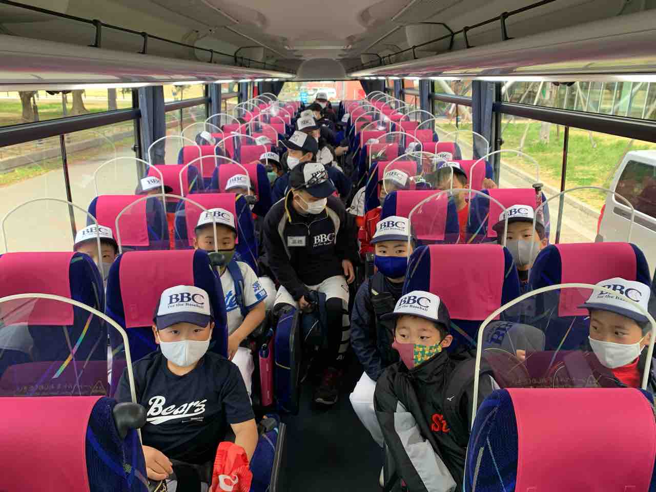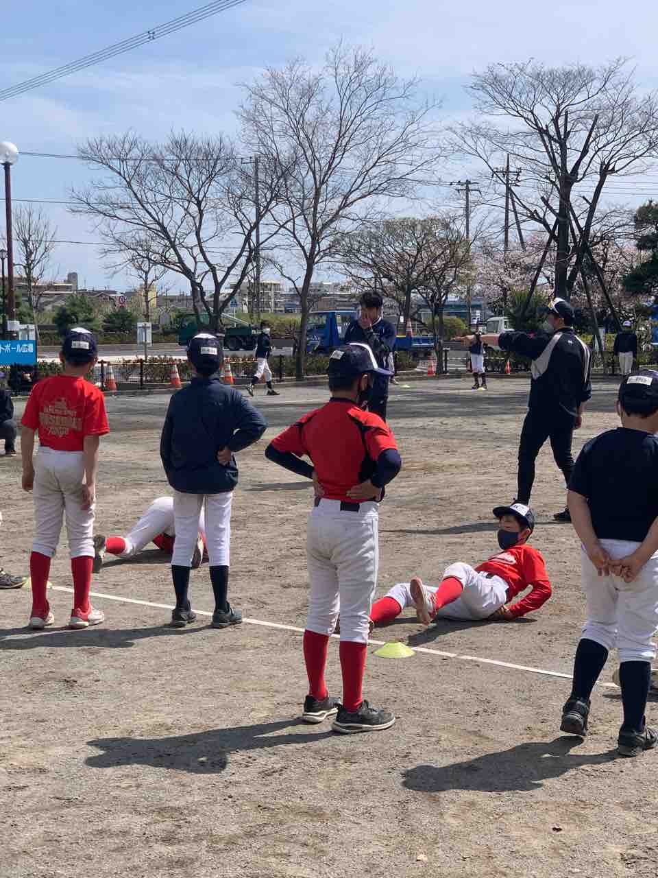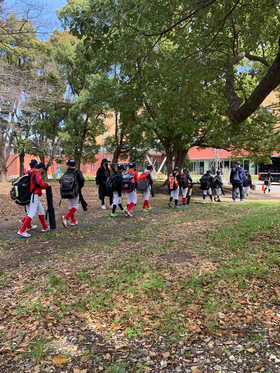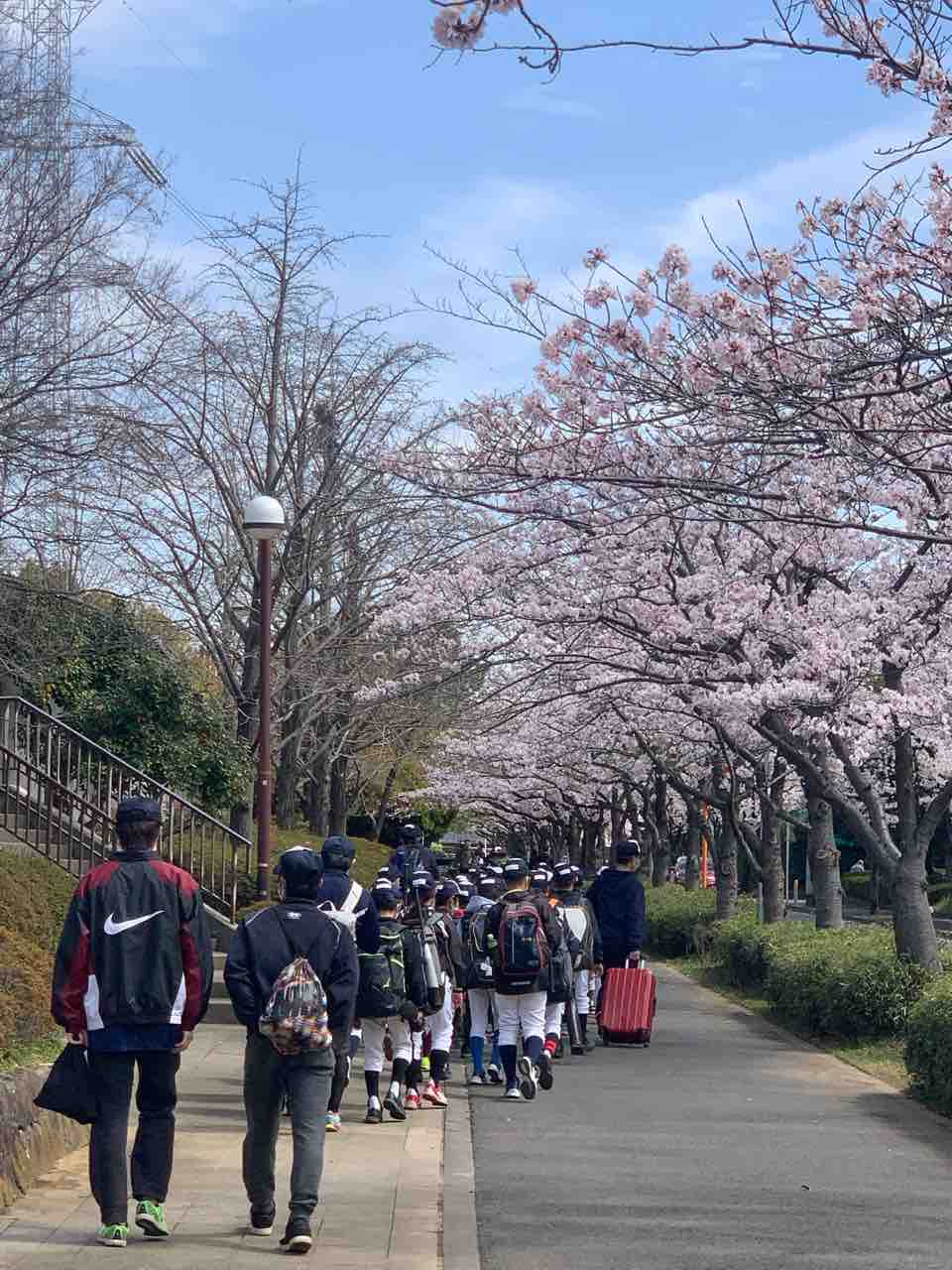 桜のトンネルがみんなをお出迎え。今日の練習場、なぎさグランドに到着です。
