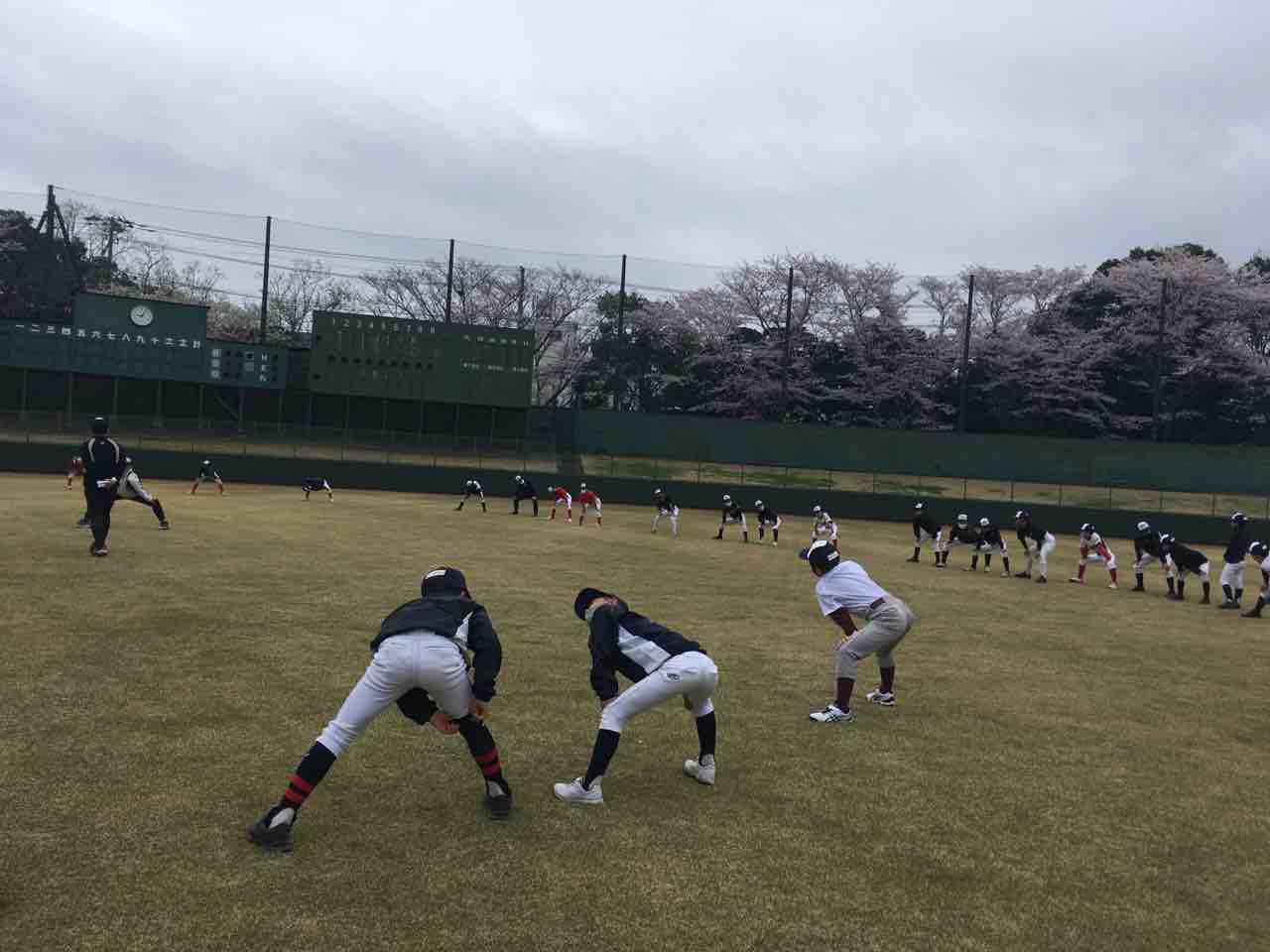 桜に囲われた大きく綺麗な球場で、まずはウォーミングアップです!