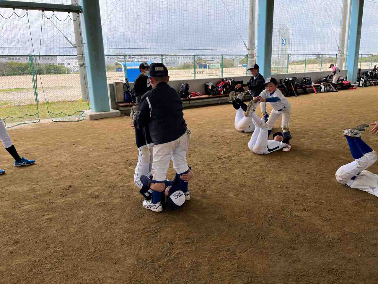 グランド内に、ダイヤモンドを2ヶ所作り、低学年、高学年に別れての守備練習です。キャッチボールを済ませ、