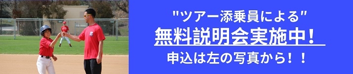 安心して | 日常と環境が異なる場所に、お子さまを安心してお預けいただくために、留学期間中のお子さまの様子を、弊社野球短期留学ブログにて報告します。当日の練習や英語のレッスンなどの様子を翌日までに、数枚の写真と説明文でご報告します。 |