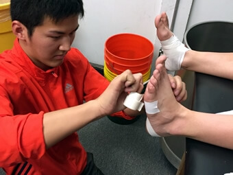 バスケットボール部などの遠征にも帯同させてもらいましたが、なんとバスで片道6時間の移動。長時間移動後の公式戦はカルチャーショックを受けましたね(笑)。それでもトレーナーは選手をケアしなければならないので「疲れた」など言ってられません。僕らトレーナーが潰れたら、選手、チームに迷惑をかけてしまうので、自己管理がいかに重要かを痛感しました。僕は専門学校卒業後に、アメリカの大学に入りアスレチックトレーニングを専攻したいと、今回の実習体験を終え心に決めました。もっともっと英語を勉強して、いつか五明さんの様にオレゴン工科大学で仕事がしたいです!