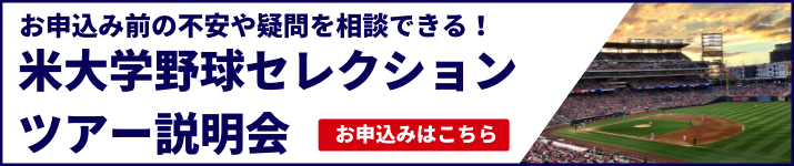 安心してツアーに | アメリカ大学野球セレクションツアーは現役または元プロ野球選手による指導及びレクチャー、またプロ球団スカウトとの接触はないため、日本野球学生野球憲章の規定に抵触することはありません。 |